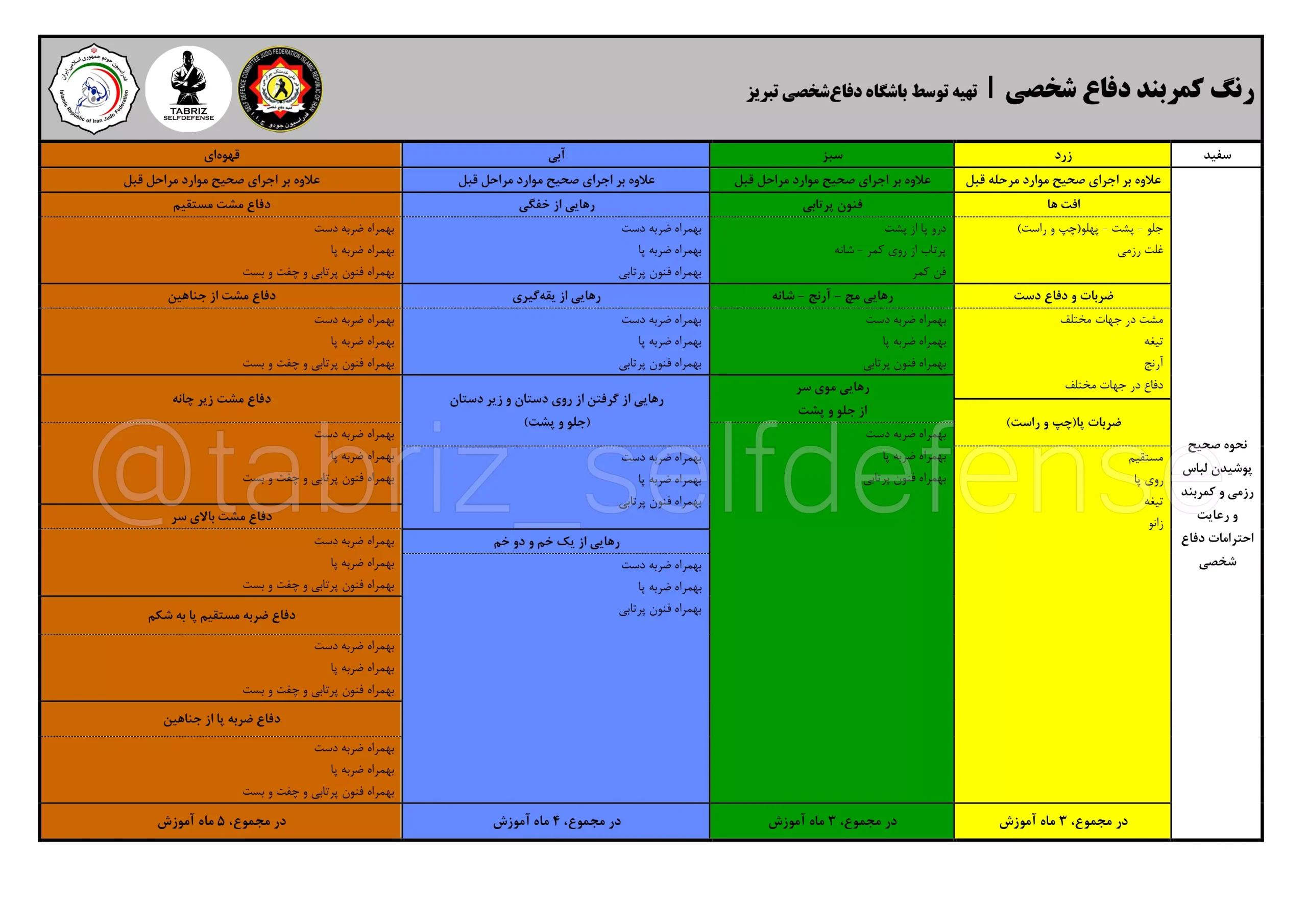 اشل(جدول) کمربند های رنگی دفاع شخصی